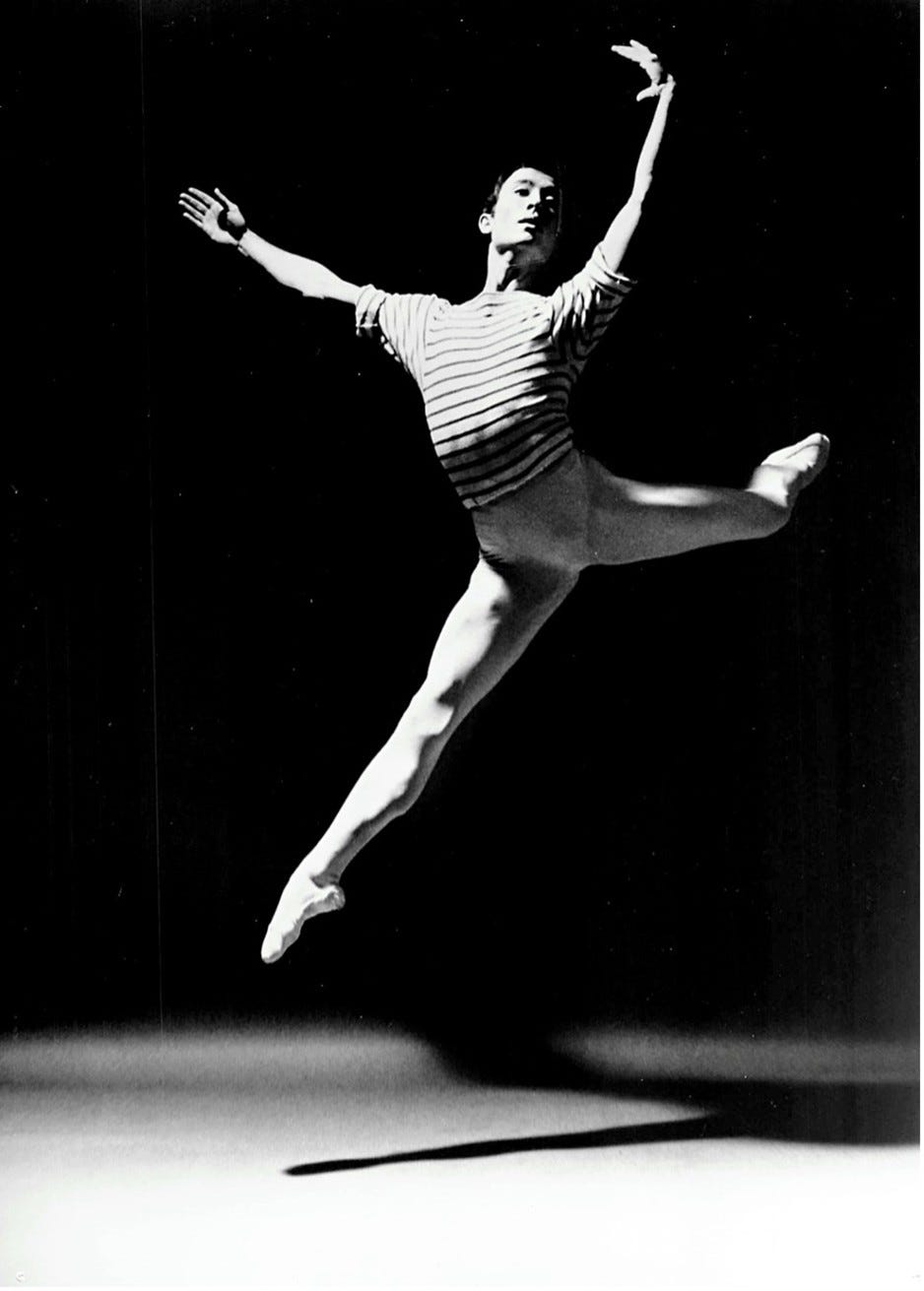 WalkYourTalk: How does ballet continue to have a special meaning for you today? It’s indeed rare that a teacher like you is still active. At ABT. Irina Kolpakova, at 92, is still coaching actively and taking the subway home. You are in great shape. Any secrets to share? Finis: No more double pirouettes or petit allegro - I only teach my "adult babies" once a week - I’m lucky to have Mayumi Omagari who demonstrates beautifully as my teaching assistant. What interests me is teaching people who have no aptitude or ideal body for ballet and it keeps me going working with intelligent people who have always loved ballet and enjoy exploring the technique, musicality, and artistry. Most of my "regular" babies know my barre exercises which haven't changed much since the pandemic. I take the subway to and from Pearl Studios in mid-town 8th Avenue and 35th Street. Since my first video in 1995, today millions of student and teachers around the world study and teach from my more than 50 instructional videos and use my orchestrated CDs composed by Scott Killian. I consider myself 95% retired and am making up seeing movies and reading books I never had time for while teaching 20 classes weekly and flying on weekends to studios all over the USA. Since I do all my viewing at a big Mac on my desk, I have a timer which rings every 15 minutes and reminds me to stand up and move about, or hang from a door bar, or pull on the kitchen sink to stretch my lower back. Some of these exercises are included in classes on DVDs. They are all available to stream from my website. (Grand Pas Espagnol by Ben Harkarvy: Helgi Tomasson, Elisabeth Carroll, Lawrence Rhodes, Lone Isaksen, Finis Jhung, Marina Eglevsky-Photo: Fred Fehl, courtesy of Gabriel Pinski)